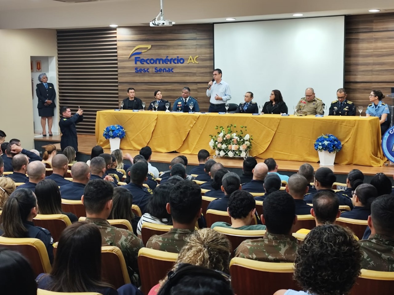 A cerimônia contou com a presença da Comandante-Geral da Polícia Militar do Acre, coronel Marta Renata da Silva Freitas Alves, e do presidente em exercício do Sistema Fecomércio/Sesc/Senac Acre, Marcos Lameira, além de autoridades civis e militares.