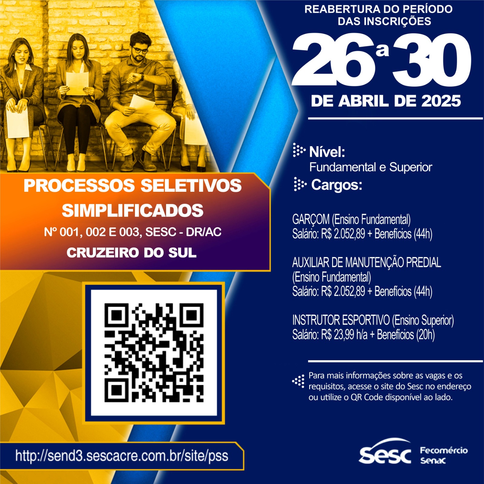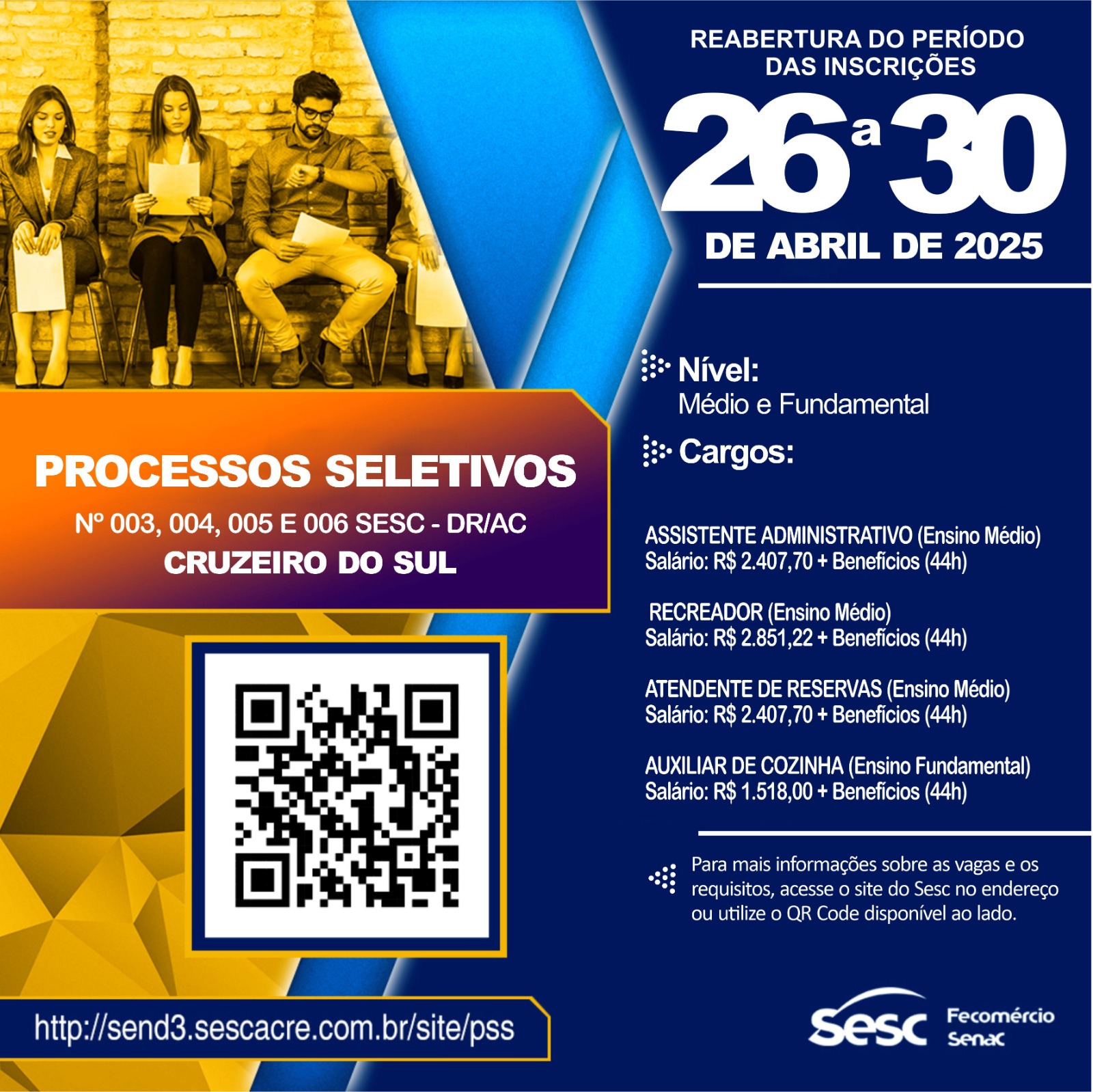 O Serviço Social do Comércio – Sesc no Acre realizou reabertura para processo seletivo e processo seletivo simplificado que tem como objeto recrutar e selecionar candidatos para provimento de vaga(s) na Unidade de Turismo e Lazer de Cruzeiro do Sul (AC). em cargos de nível médio, fundamental e superior para a cidade de Cruzeiro do Sul. As inscrições vão de 26 a 30 de abril de 2025 e devem ser realizadas exclusivamente por meio do endereço eletrônico. www.sescacre.com.br.