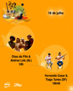 Dia 18 de julho às 18h Chau do Pife e Andrea Lais de Alagoas. Às 18h40 Fernando Cesar e Tiago Tunes do Distrito Federal.
